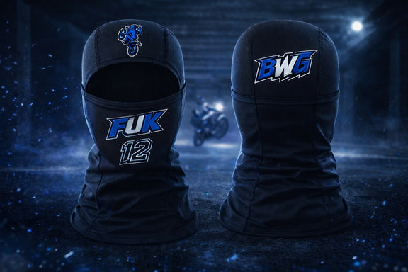 Lightweight, form-fitting performance mask designed for riding and cold-weather protection. Features a breathable stretch fabric with a snug, stay-put fit. Finished with embroidered BWG branding on the back, an embroidered rider icon on the top, and bold FUK 12 embroidery on the front. Built for comfort, visibility, and street-ready style in red or blue colorways.