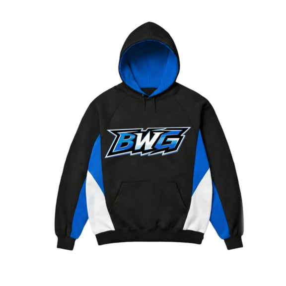 Custom cut-and-sewn hoodie featuring a stitched BWG logo on the front and a screen printed design on the back. Black base with bold blue and white panel detailing, blue-lined hood, and a premium heavyweight feel. Built for everyday wear and street riding.(COLD MACHINE WASH AND AIRDRY OR LOW TEMP DRY)